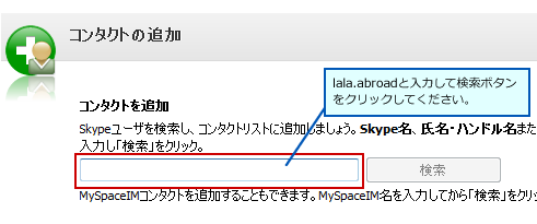 ウィンドウにある新規ボタンを押して「lala.abroad」を入力し検索し連絡先を追加してください。