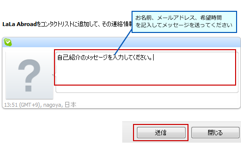 追加時のメッセージにお名前、メールアドレス、希望時間を記入してメッセージを送ってください。
