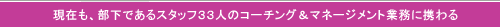 合わせて33人のスタッフのマネージメントをする“フロア統括マネージャー”として働いています。