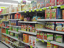 こっちの朝食の定番、シリアルのコーナーへ行くと、種類の多さにびっくりしてしまいます。写真のように、棚のはしからはしまで全てがシリアルです。パンの種類も豊富で、 ブラウン、ホワイト、ひまわりの種入り、ドライフルーツ入りといろんな食パンが置いてあり、ほとんどがサンドイッチサイズの薄さで、日本のサイズの少し分厚い食パンはありません。