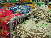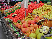 スーパーに行くと、大人でも座って乗れそうなくらい大きなショッピングカーを転がしてスタートです。最初は日本と同じように果物や野菜のコーナーになっています。 たくさんの果物が色鮮やかに陳列されており、ほとんどが量り売りになっているので1個単位から購入することができます。 じゃがいもや玉ねぎ、にんじんなどは業務用のような大きな袋入りで販売されていたりします。