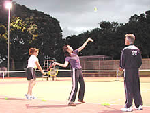 私は真ん中のクラスに入りましたが、どのクラスも初めはグリップの持ち方から教えてくれます。初日にフォアハンド、バックハンドを教えてもらい、2日目にはサーブとスマッシュ、ボレーを教えてもらいました。そして、今日3日目はそれら全体の復習、そしてダブルスの試合形式の練習まで。本当のビギナー達がたった3週間でなんとか形になりました。それもこれも先生のコーチがうまいから!感心するくらい教え方がうまいのです。