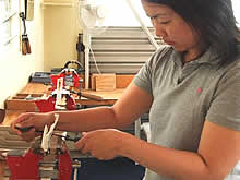 デザインが決まると、骨を機械に固定して糸鋸のようなもので実際のラインよりも外側をおおきく削っていきます。 次に電気の鑢のようなものでラインにあわせて周りを削り整えていきます。外側のラインが決まると内側はペンシル型のマシーンでくりぬいていきます。その後、鑢で表面を磨いていくとお店で売ってるようなつるつるのカービングが出来上がります。