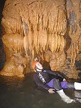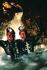 ヘッドライト付きヘルメットにウェットスーツを着込み、タイヤチューブを抱いてワイトモ洞窟内を進んで行くというアドベンチァーツアー。 洞窟内の川にふわふわ漂いながら見あげると神秘的に蒼白く輝く土ボタルの光に遭遇。