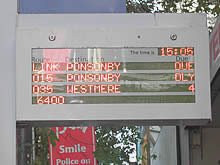 ただし、これはあまり正確ではありませんというより、あまりあてになりません。昼間は約10分間隔、夜は20分間隔で運行していますので、その場でじっと待つほうが賢明です。