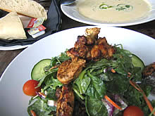 私はタンドリーチキンサラダで友人はクラムチャウダースープでした。ニュージーランドのお店ではスープはサイドメニューというよりはメインほどの多さで、パンもついてきます。ランチでスープだけ頼んでも、それだけで十分な量になります。