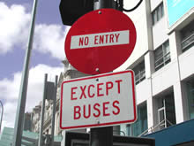 「NO ENTRY. EXCEPT BUSES.」日本の“進入禁止”の標識と同じマークですね。 そうです、まさに「進入禁止」です。「ENTRY」は日本語でも試合などに「エントリーする」などと使われているので「〜に入ること」などという意味と分かります。