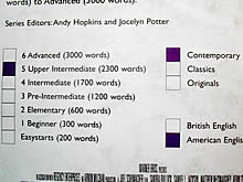 というのも、この「Penguin Readers」は裏表紙に本の内容のレベルわけがはっきりされていて、自分のレベルにあった本を簡単に選ぶことが可能なんです。たとえば本の裏に書いてあるレベルをみると「6Advanced(3,000words)=上級者用(3,000単語)、Contemporary=現代もの」などの説明が。