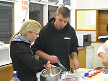 たとえば先日はデザートの日で、「Chocolate Mousse(チョコレートムース)」と「Tiramisu(ティラミス)」でしたが、『Beat the egg yolk and sugar till frothy』といわれ、「Beat」の意味が分からず、周りの人がやっているのをみて初めて「泡立てる」っていう意味だと分かったり、「melt」の意味が分からず、一緒に組むことになったKIWIのおばさんが手伝ってくれました。