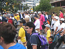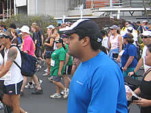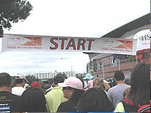 当日は、みんなは歩きコース、私は走るコースに参加しました。説明書には「ベビーカー、自転車、ローラーブレード禁止」と書いてあったのに、たくさんの人がベビーカーを押してるし(ほとんどがパパ!)、子供が自転車に乗ってるし、若者はローラーブレードはいてるし、本気で記録を狙う人には向いていない大会かもしれません。でも、いろんな仮装をしている人がいたり、家族や友達同士でおそろいのTシャツを着ているのを見たり、ランナー同士が気軽に声をかけあったり、とてもほのぼのしていて楽しかったです。