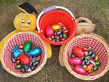 イースターの当日、私のホームステイ先でも朝からさっそく家のまわりでチョコレート探しが始まってました。朝起きると、朝食よりも前に子供達はバスケットやバケツを持って、スタンバイ!!ホストマザーに「あなたもチョコを集めなさい」とバケツを貸してくれました。庭に出ると植え込みや芝生の中、窓の枠などに卵のチョコレートがコロンコロンと転がっていました。
