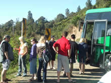 さて、旅行当日、ドキドキしながら「バスツアー」のオフィスへ。受付を済ませると、そこには一人の女の子が座ってました。その子はイングランド出身の子で、生まれたのはNZらしいのですが、2歳のときにイングランドに移ったので、NZの記憶を覚えていないとか。今回は高校卒業を期にNZ旅行を決めたそうです。たわいもない話をしてると、いつの間にか人・人・人!! どうやらバスが到着した様子。