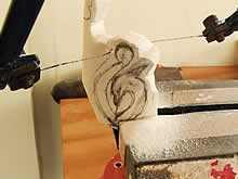 デザインが決まると、骨を機械に固定して糸鋸のようなもので実際のラインよりも外側をおおきく削っていきます。 次に電気の鑢のようなものでラインにあわせて周りを削り整えていきます。外側のラインが決まると内側はペンシル型のマシーンでくりぬいていきます。その後、鑢で表面を磨いていくとお店で売ってるようなつるつるのカービングが出来上がります。